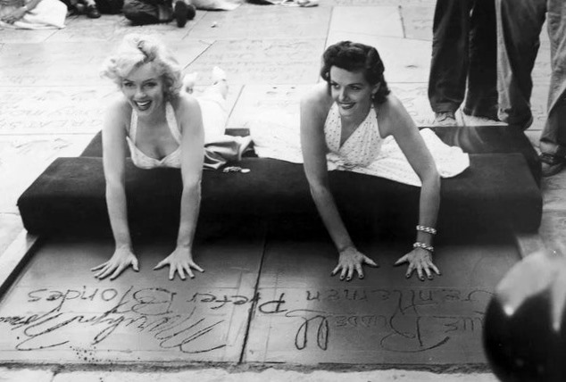 Marilyn Monroe and Jane Russell leaving their hand prints in the cement at Grauman's Chinese Theater in 1953