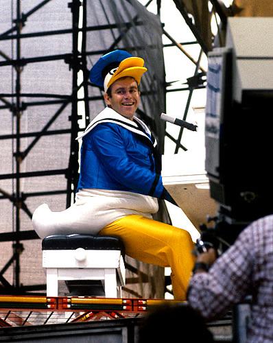 Elton John performing in his Donald Duck costume at New York, 1980
