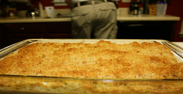 Cook, stirring to crumble, until evenly browned. Drain, and transfer to a 9x13 inch baking dish, or large casserole dish.